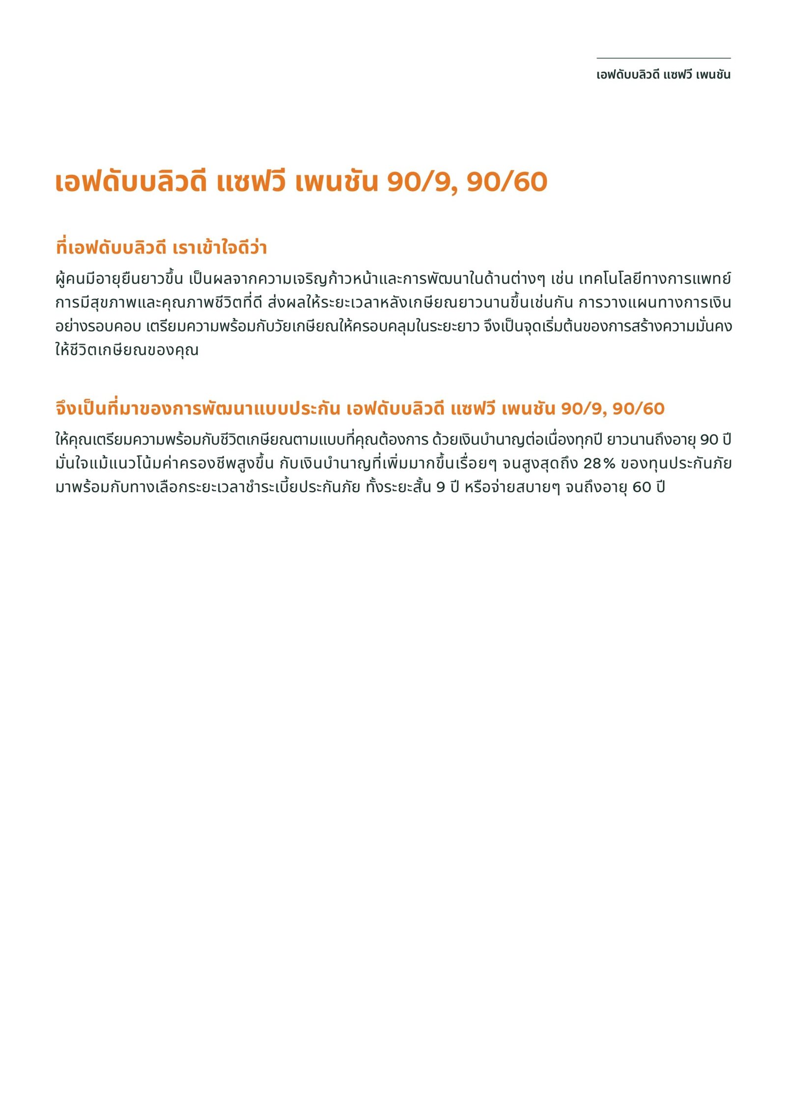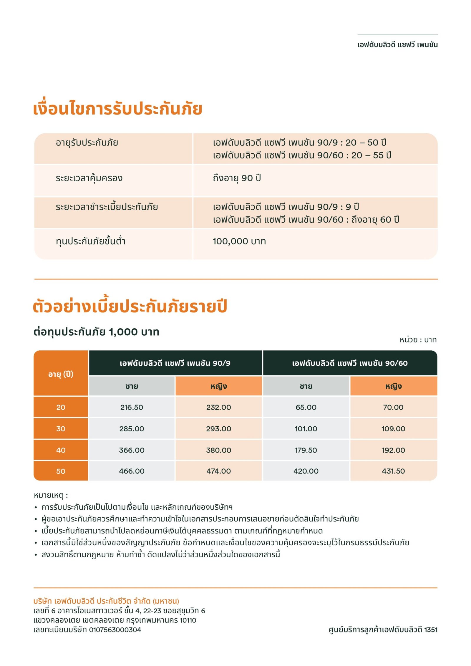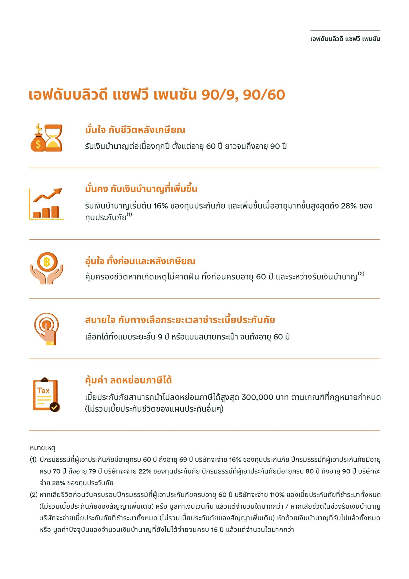 เอฟดับบลิวดี แซฟวี เพนชัน 90/9, 90/60 เอฟดับบลิวดี แซฟวี เพนชัน 90/9, 90/60 (ชีวิตเกษียณที่คุณกําหนดได้เอง) เอฟดับบลิวดี ประกันชีวิต (FWD) ขอข้อมูลเพิ่ม กดที่นี่